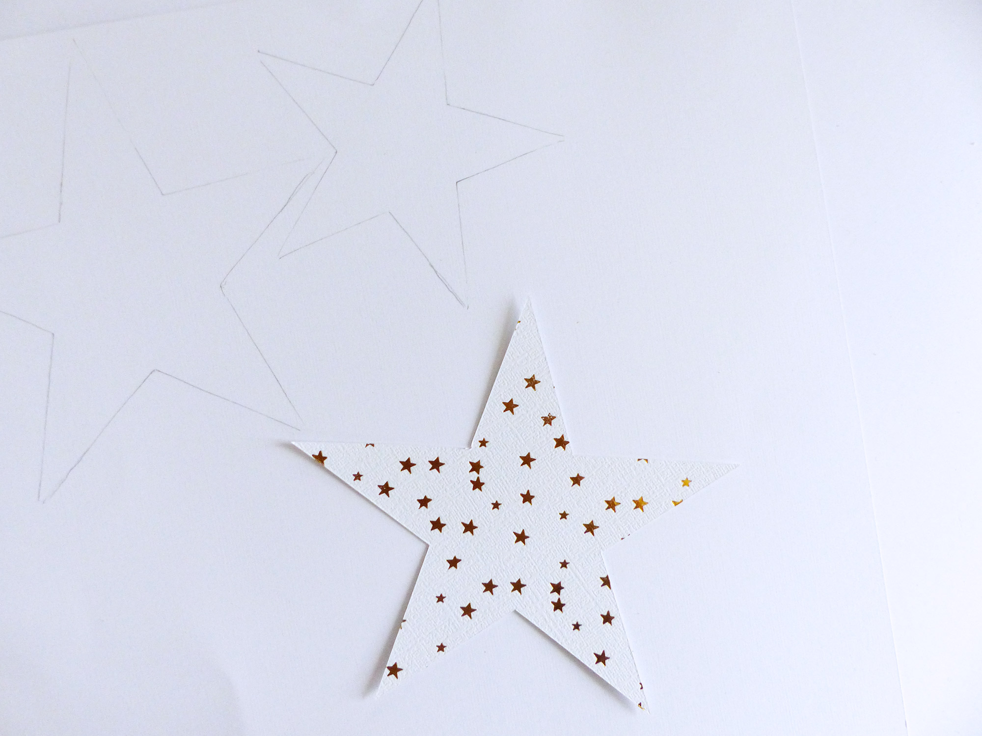 Pour commencer, à l’aide des gabarits préalablement imprimés, vous devez tracer les étoiles au dos de chaque papier scrap. (Ma maman avait un peu étiré les étoiles pour en obtenir avec des branches plus fines). Au total, nous avons fait 4 étoiles (2 grandes et 2 petites) par papier, pour en avoir 12.