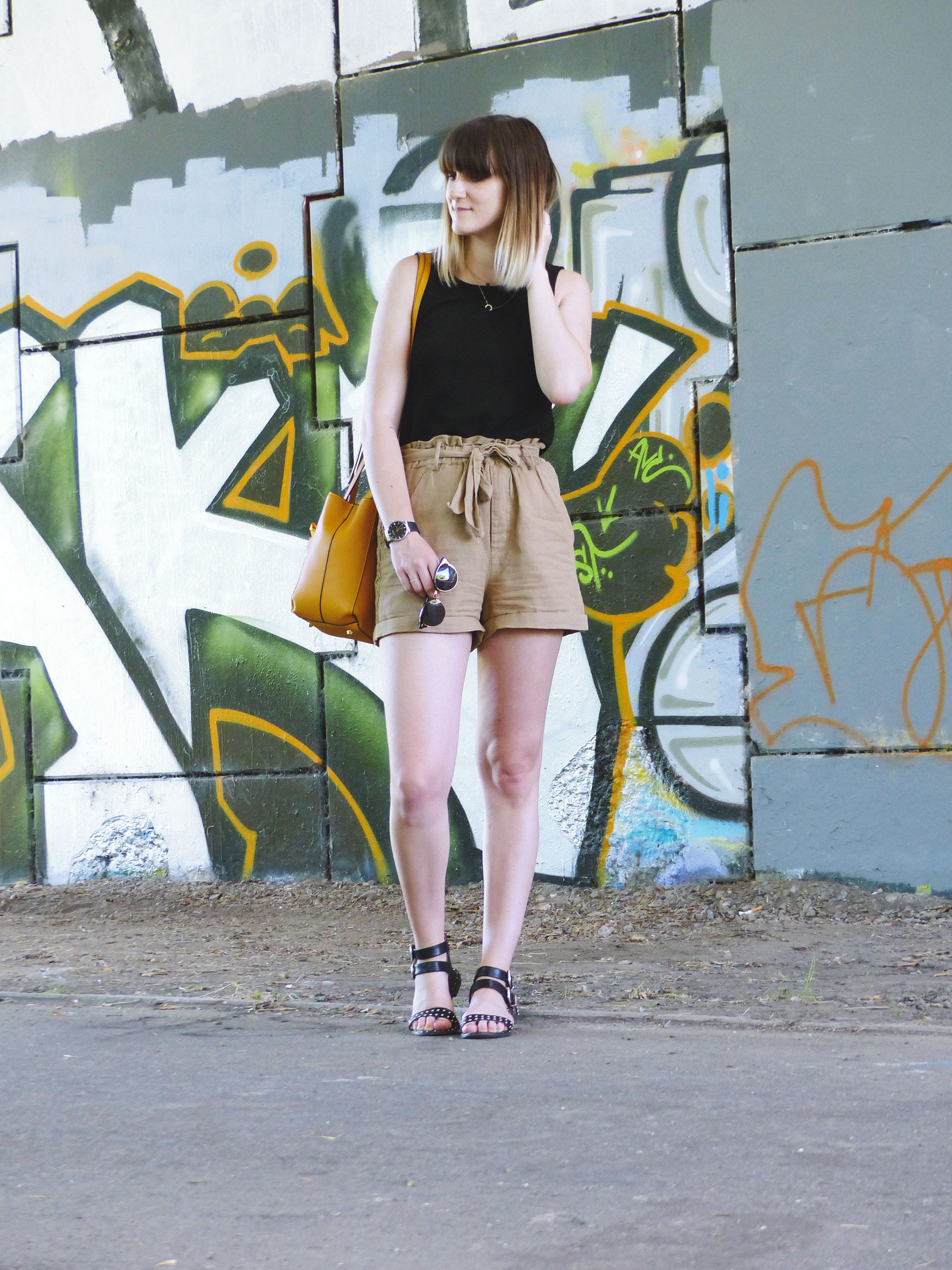 En haut, j’ai préféré opté pour un haut noir hyper simple pour qu’on garde le focus sur le short et les accessoires. En accessoires, un de mes colliers favoris, ma nouvelle paire de sandales à clous et le sac de couleur pour dynamiser le tout. Un de mes looks favoris de cet été !